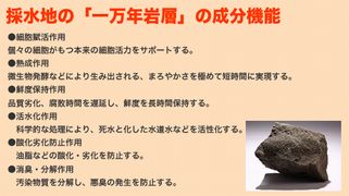 窒素・リン・ケイ酸などの無機栄養塩が豊富に溶け込んでおり、陸上では取りにくい人体に不可欠なミネラル他、微量元素がバランスよく含まれています。また、深海の高圧化にあって大気汚染や陸水に含まれる化学物質、大腸菌、一般細菌に汚染される危惧の少ないクリーンな海水といえます